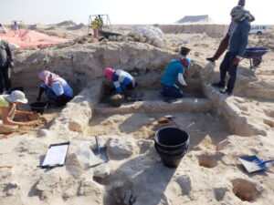 Every year since 2009, a University of Copenhagen team, working in collaboration with the Qatar Museums Authority, has been undertaking fieldwork at the site. The photograph shows archaeologist Sabrina Salmon excavating date presses in the center of the 18th-century souq, or market along with some of the field work crew. Here we have a Belgian working for a Danish University alongside project-trained Eritrean and Bangladeshi workmen on a field project in Qatar – providing an excellent symbol of the multinational diversity that lies at the heart of our global discipline.